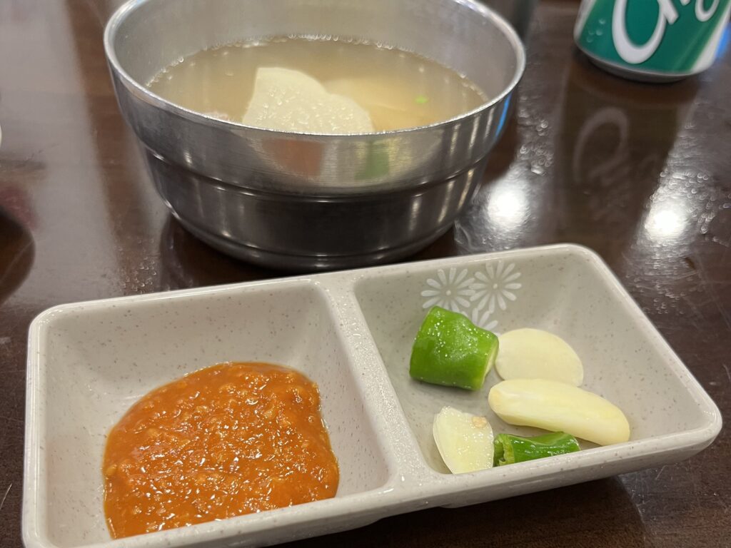 大根入りの優しい味わいの牛骨スープに、青唐辛子・ニンニク・サムジャンがセットで登場。韓国食文化ならではのサービス精神が光る内容です。