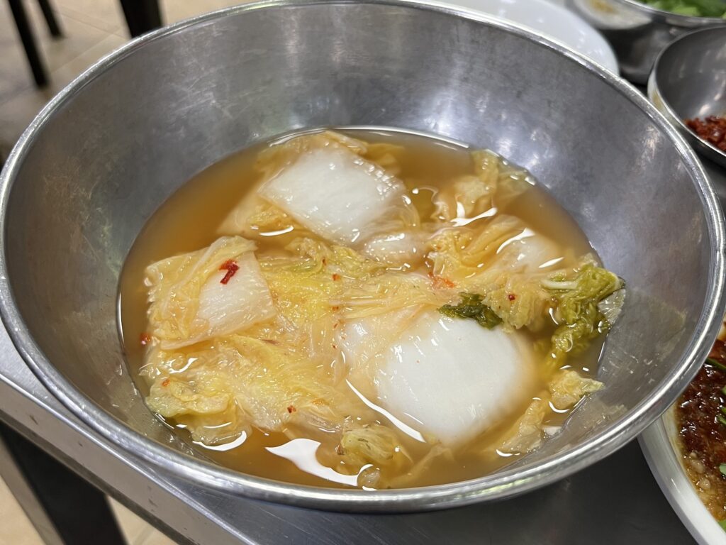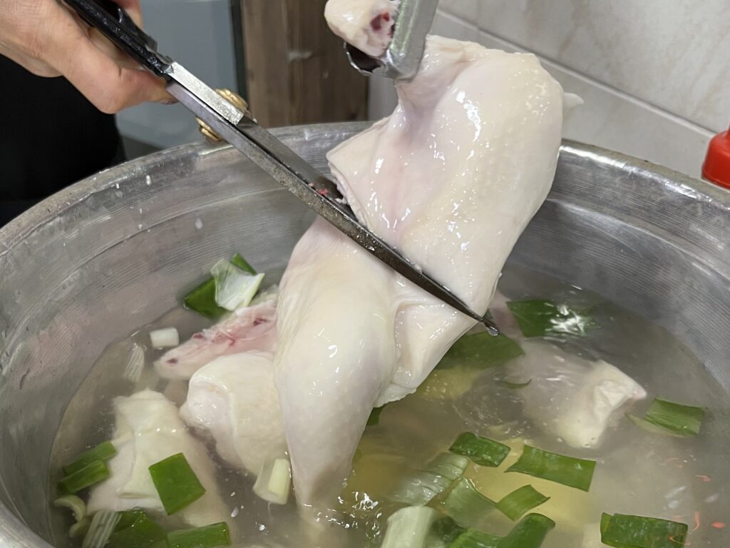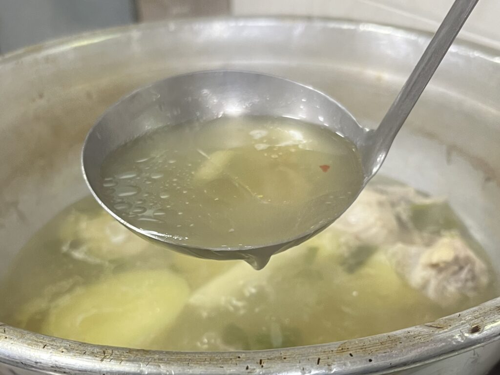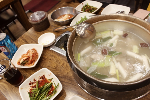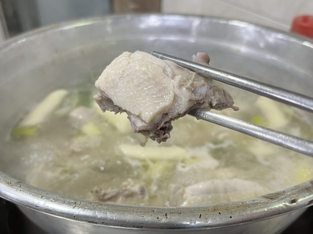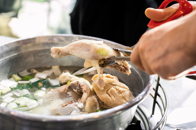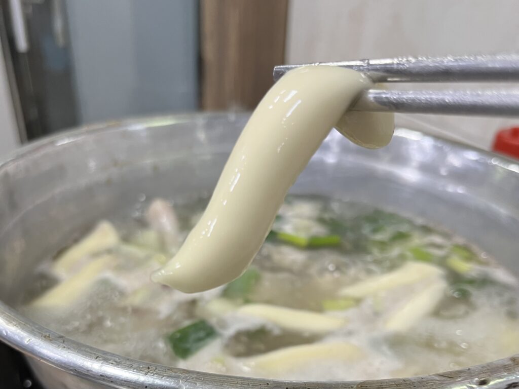 スープはそのまま飲むも良し、〆にカルグクス(韓国手打ち麺)を投入して鶏出汁の旨味を最後まで堪能するのもおすすめ。