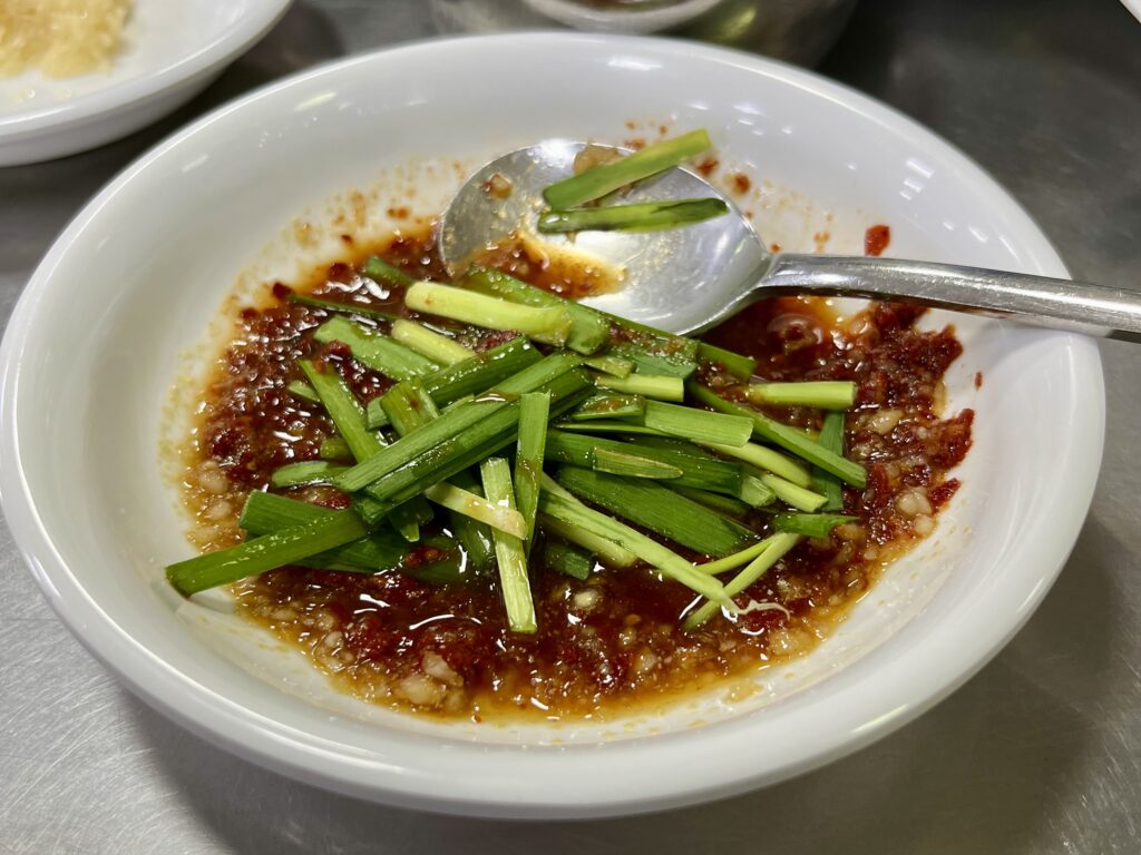 テーブルには唐辛子、辛子、酢、自家製醤油、ニンニク、ニラなどの薬味が並び、自分の好みに合わせてじっくり一方向に混ぜて調合するスタイル。ピリ辛で香り豊かな特製タレは、鶏肉と抜群の相性を誇り、シンプルな鍋に深みを加えてくれる名脇役です。