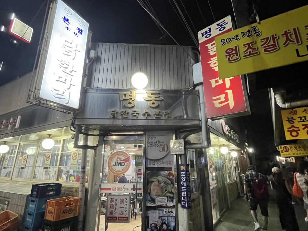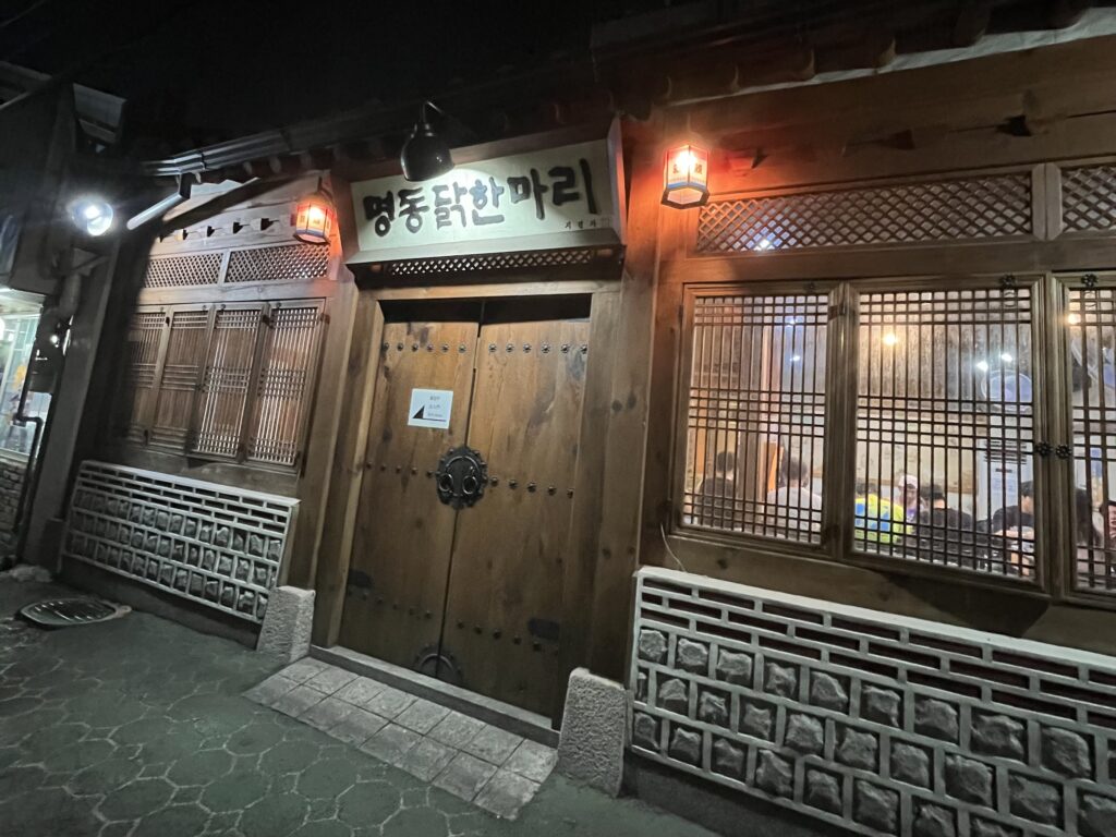 地下鉄4号線・東大門駅9番出口から徒歩5分。鶏鍋専門店が軒を連ねる「タッカンマリ横丁」にある「東大門明洞タッカンマリ本店」は、韓屋スタイルの外観が目印の老舗。観光客でも安心して入れる雰囲気で、珍しく1人前から注文できるのが魅力です。周囲には似た店構えの店舗も多くありますが、本店は新館の韓屋や看板で区別できます。