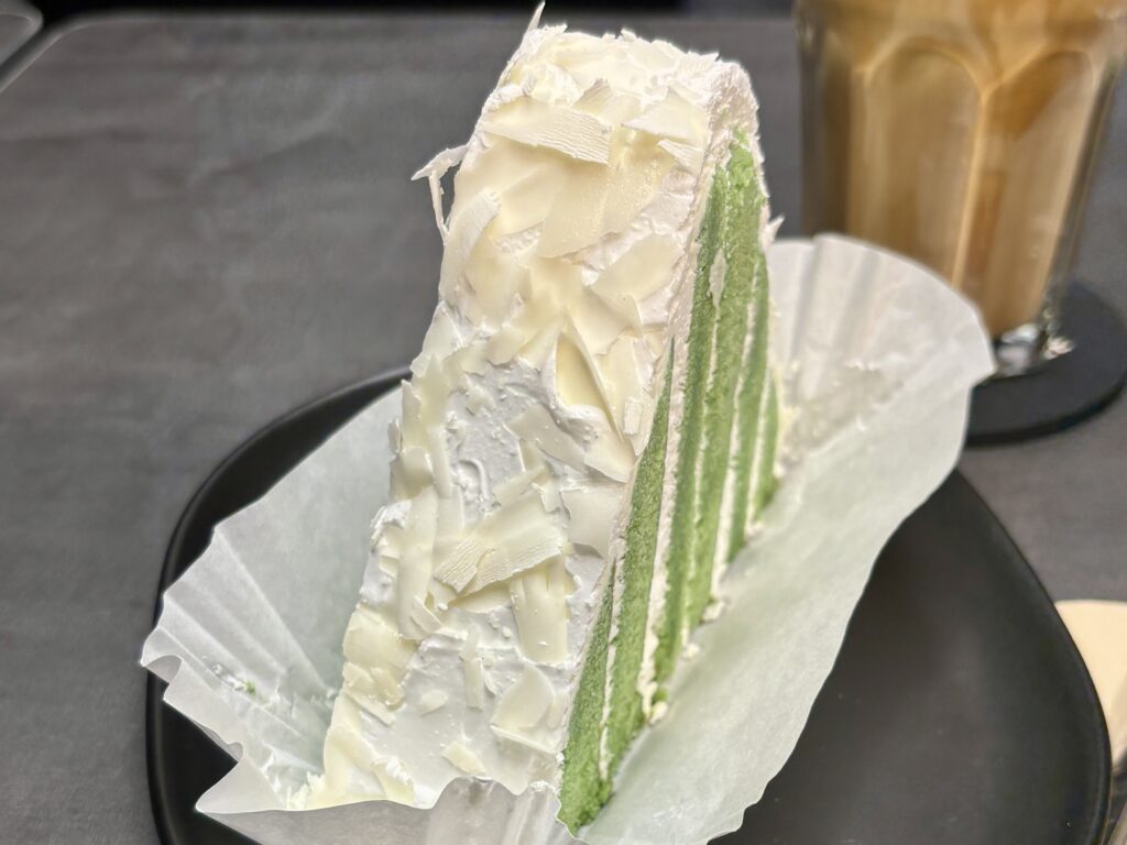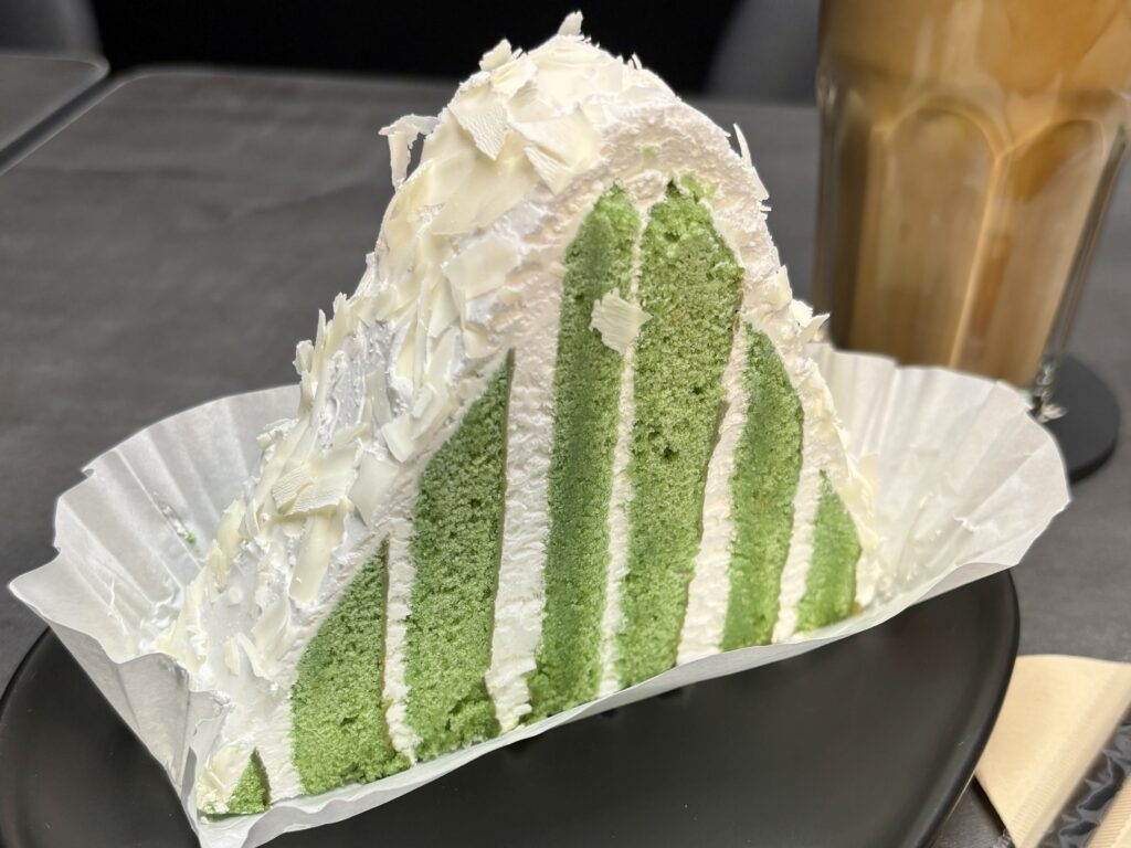 「トライアングルグリーンティーケーキ(8,500w)」は、濃厚な抹茶の味わいと程よい甘さが絶妙なバランスのスイーツ。しっとりとした食感と鮮やかな緑のビジュアルが印象的で、ボリュームも満点。抹茶好きにはたまらない贅沢なひと切れです。コーヒーとの相性も抜群で、セットで味わうのがおすすめ。