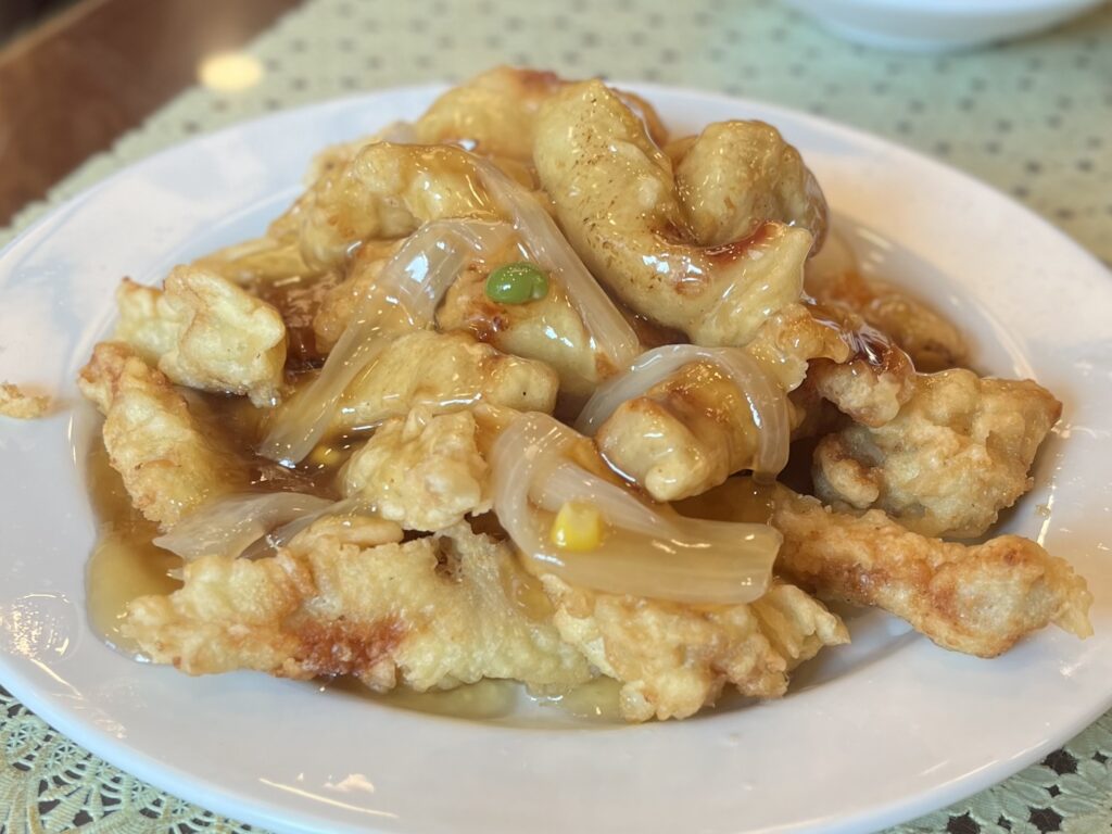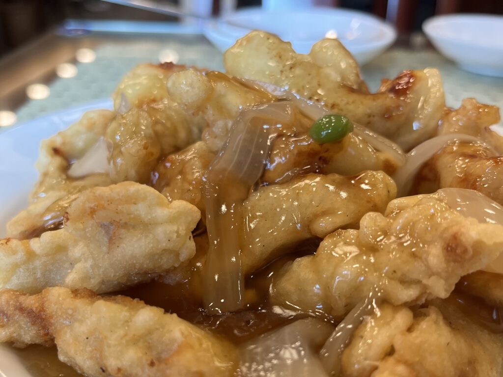 韓国ドラマでもおなじみの「タンスユク(韓国式酢豚)小17,000w」は、サイドメニューとして人気。細長く揚げた豚肉にシンプルな甘酢ソースが絡み、玉ねぎの食感もアクセントに。サクサク感がありつつ、ボリュームたっぷりで、数人でシェアするのもおすすめです。