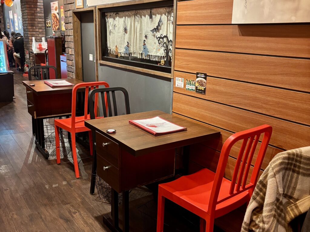 赤と黒を基調とした清潔感のある店内には、テーブル席とカウンター席を用意しています。テーブル席はデートや女子会、グループ利用にも対応しやすく、フラットな空間で会話が弾みます。