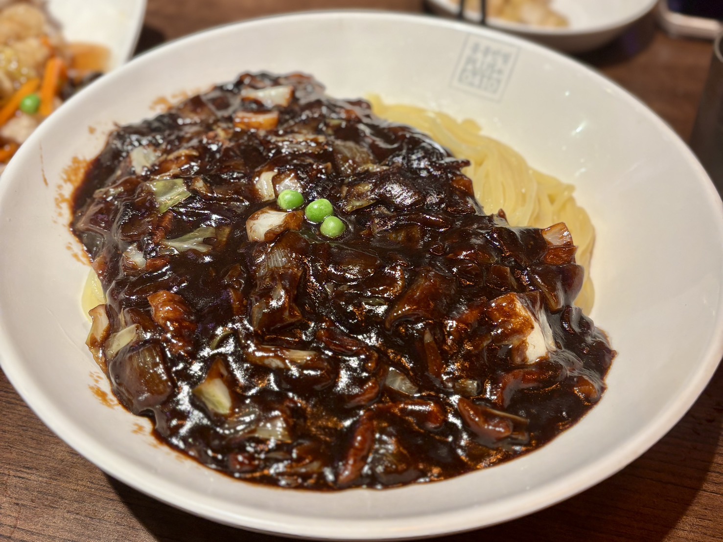 衣はカリッと軽く、中の豚肉はしっとり。甘酸っぱいソースは主張しすぎず、チャジャン麺との相性も抜群です。