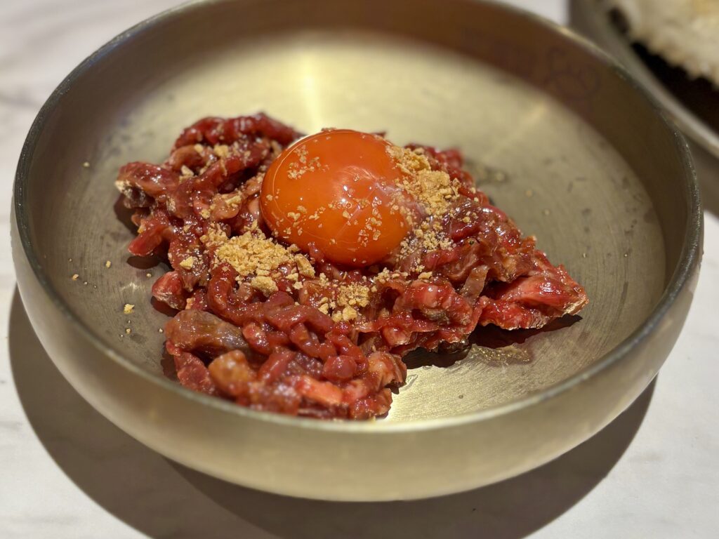 厳選された和牛をさっと炙ることで、肉の甘みと香ばしさを引き立てた贅沢メニュー。卵黄と特製タレが濃厚さを加え、韓国料理のユッケに和のエッセンスが融合したようなリッチな味わいです。