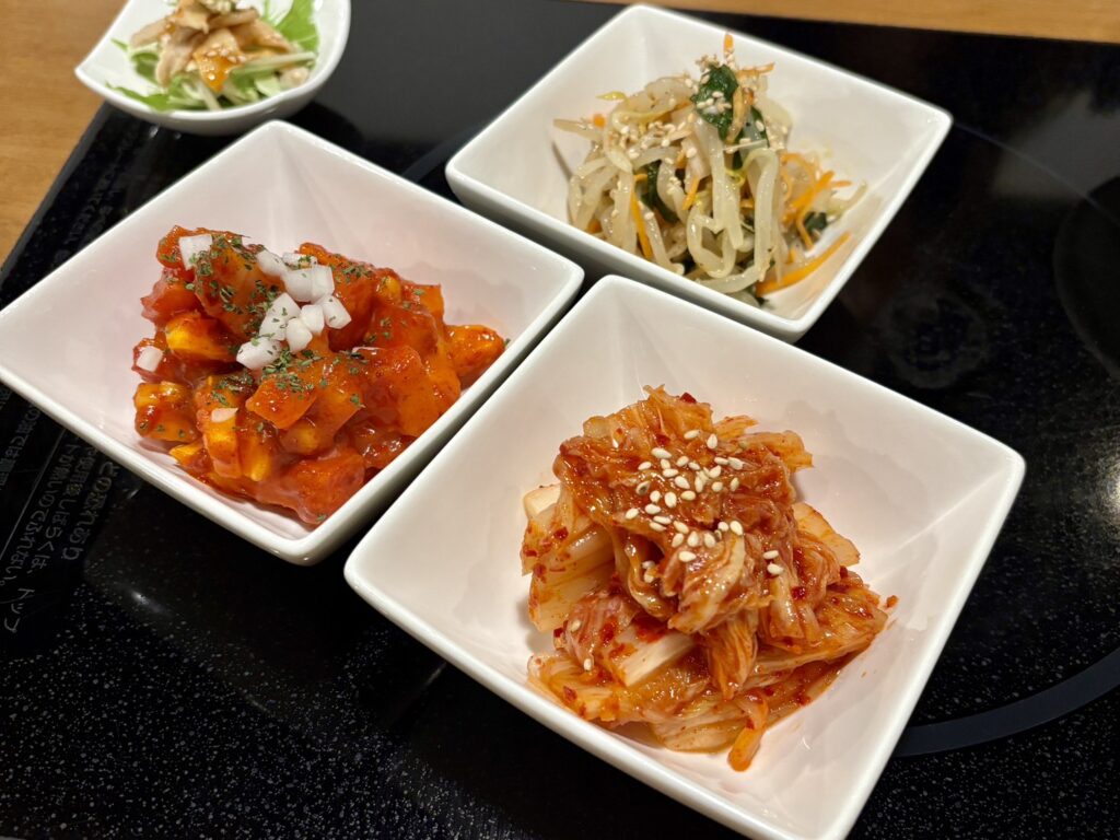 白菜キムチ、大葉のもやしナムル、キムトマトの3種構成。さっぱり感とピリ辛が交互に楽しめ、鍋との相性も良好です。食卓のリズムを整える存在といえます。
