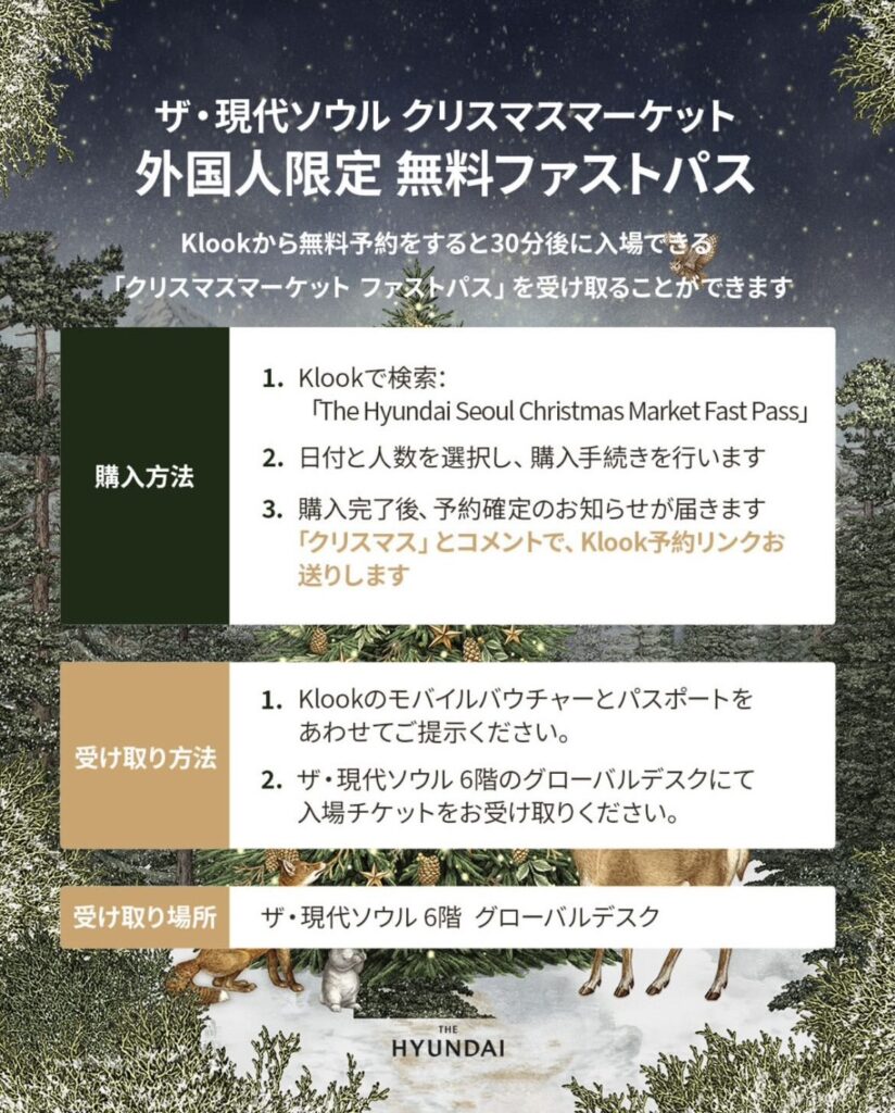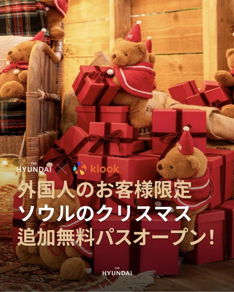 ▶現代百貨店の日本語公式Instagram(@the_hyundai_jp)に「クリスマス」とコメントすると、Klook予約リンクが送信されます。(公式案内より)