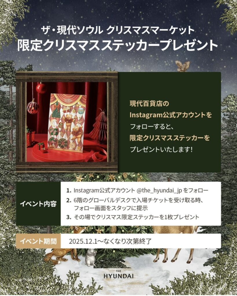 現代百貨店の日本語公式Instagram(@the_hyundai_jp)をフォローすると、限定クリスマスステッカーをプレゼント。