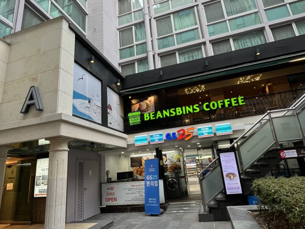 ホテルA棟1階には韓国コンビニ「GS25」、2階には人気カフェ「BEANSBINS COFFEE」が併設。 朝食や休憩、ちょっとした買い物にも便利で、滞在中の満足度がぐっと上がります