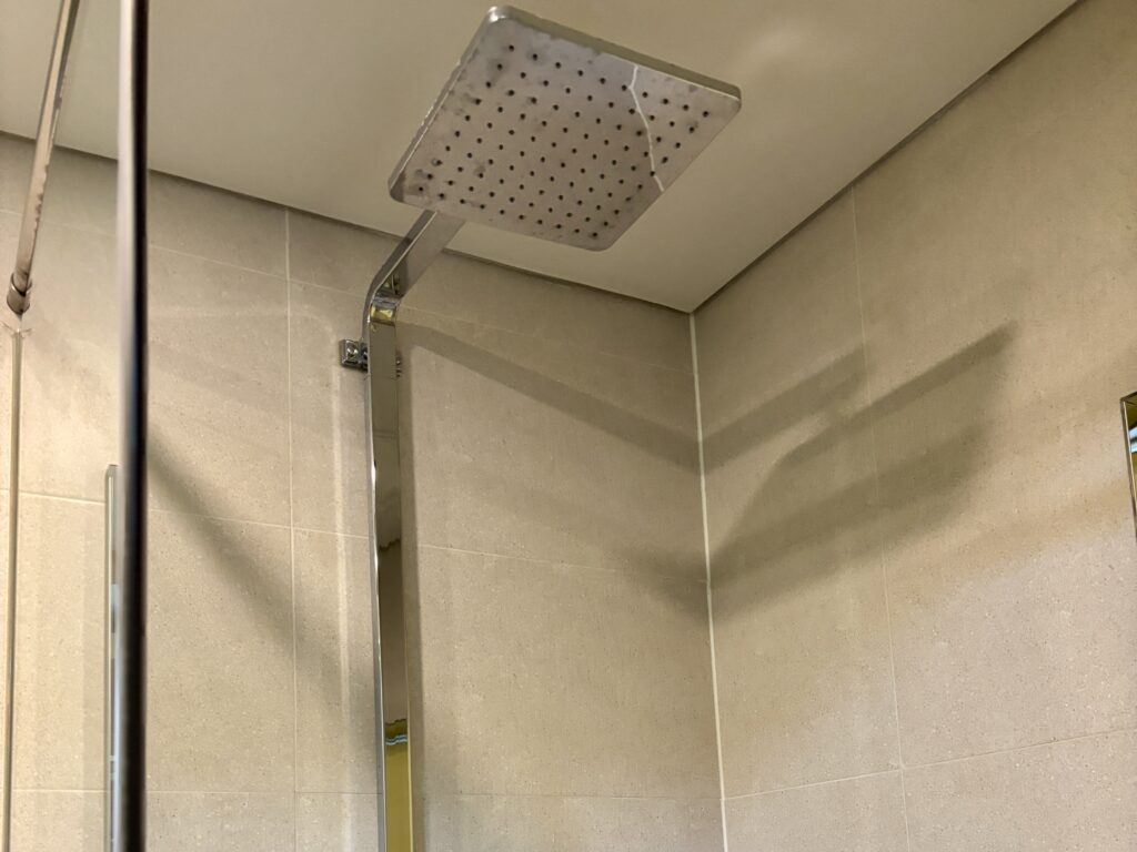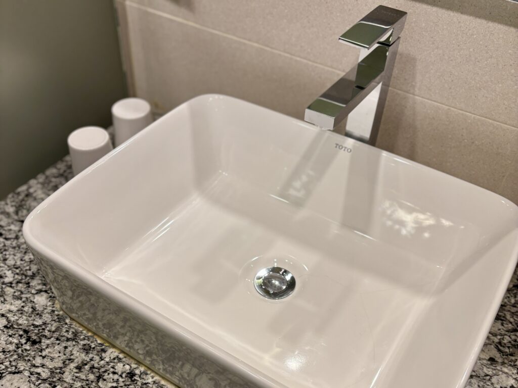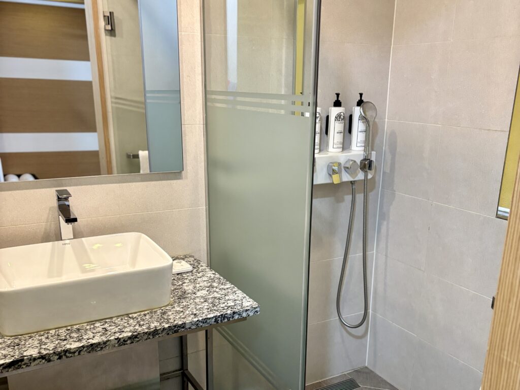 シャワーブースのみでバスタブはありませんが、洗面台はTOTO製で深さと広さがあり、衣類の手洗いにも便利です。アメニティは歯ブラシなど一部が有料のため、持参がおすすめです。